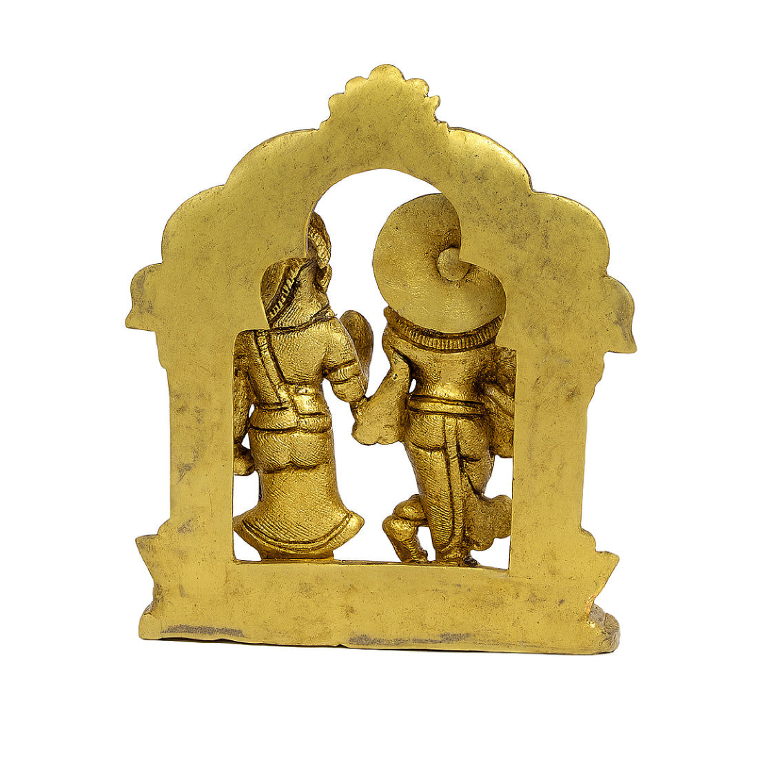 This beautifully detailed idol of Lord Krishna playing the flute alongside Radha symbolizes eternal love and harmony. Designed in a classic arch-style frame with an antique gold finish, it is perfect for home temples, living rooms, or devotional gifting. A timeless piece that brings peace and devotion into any space.