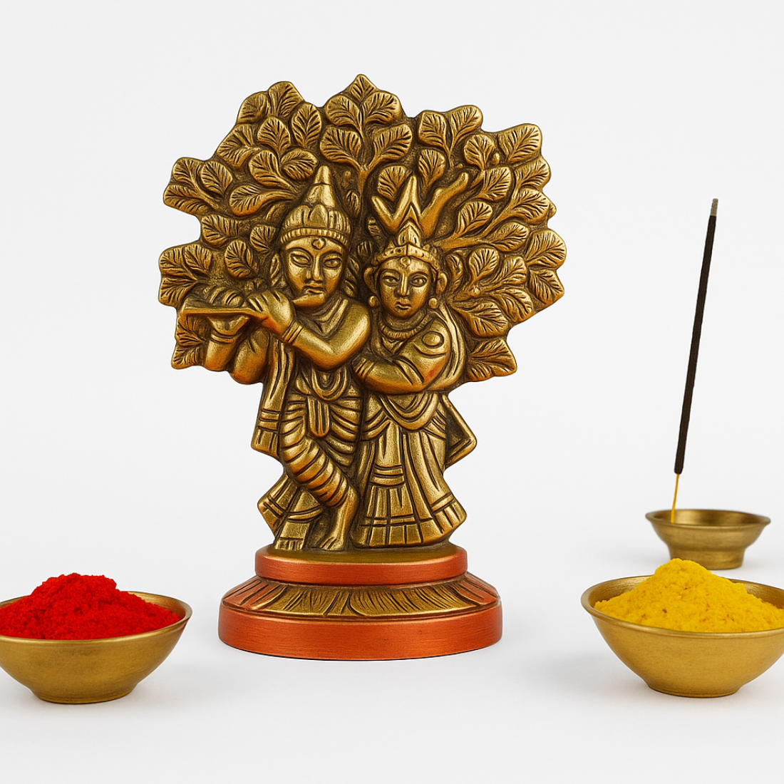This charming idol depicts Radha and Krishna standing gracefully under a beautifully detailed tree, symbolizing divine love and harmony. Crafted with a dual-tone finish and elegant base, it is ideal for home décor, pooja rooms, or as a thoughtful devotional gift.